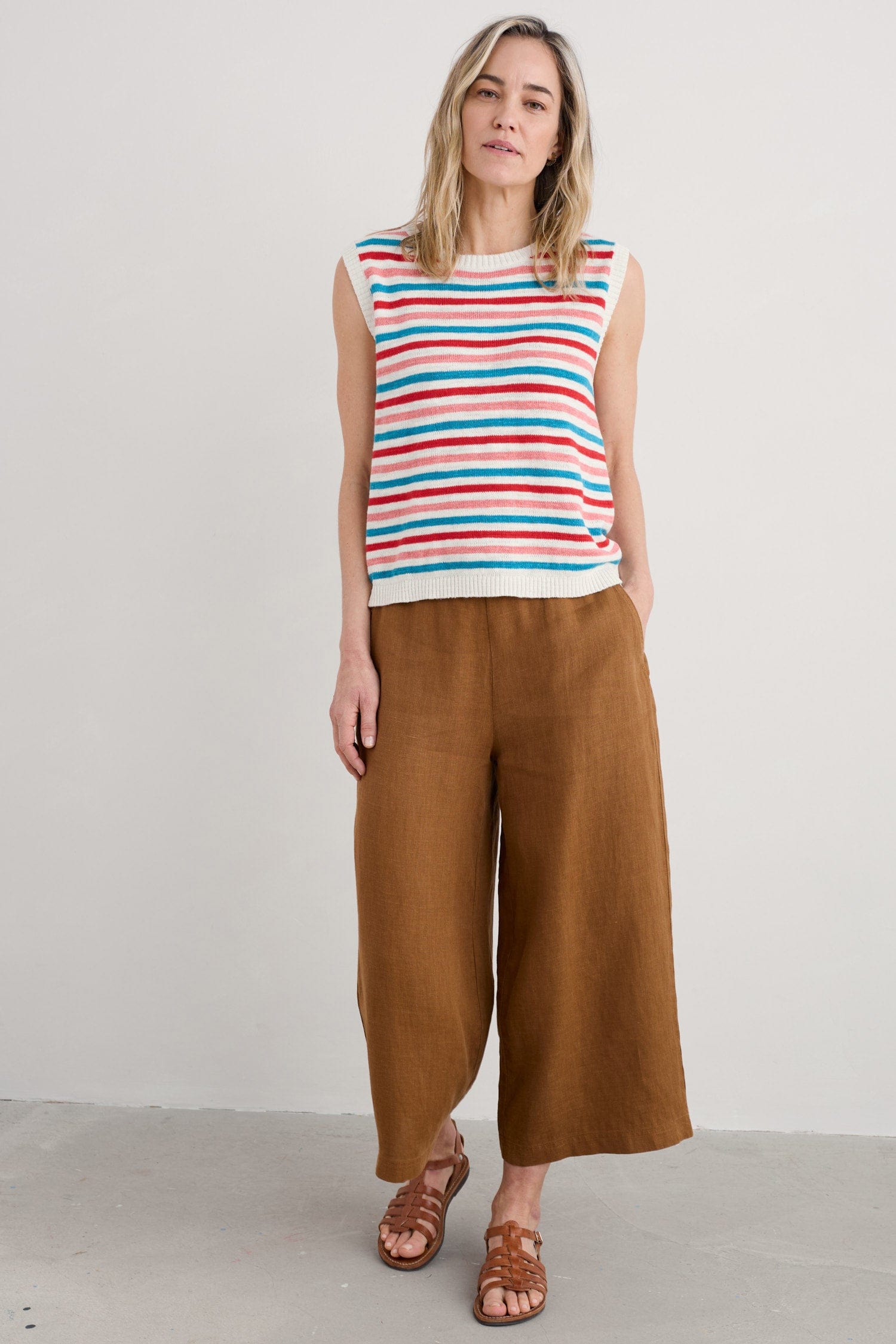 Beautifully made from an organic cotton linen slub yarn which creates a lovely lightweight natural texture. Design details include a textured stripe knit with solid trim rib detailing and functioning buttons to the back. A boat neckline, relaxed fit and sleeveless design complete this warm weather essential.