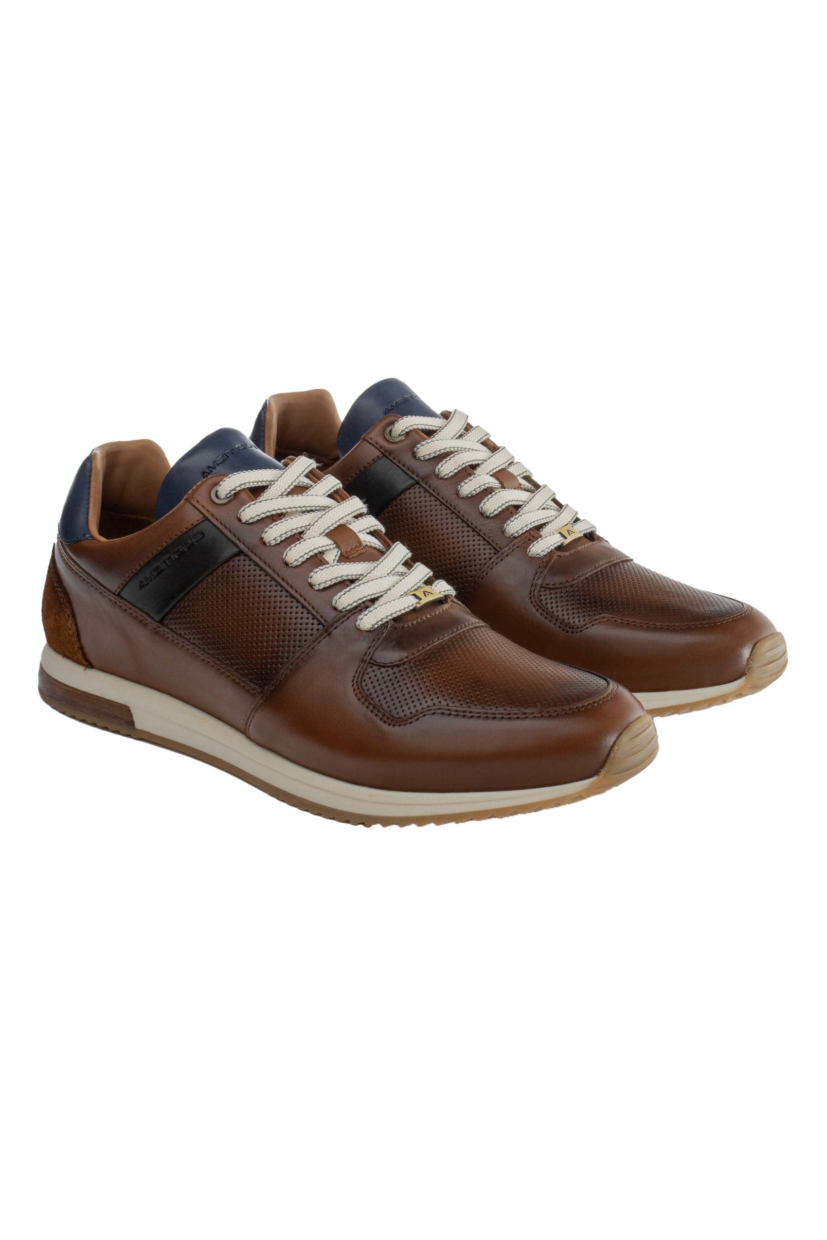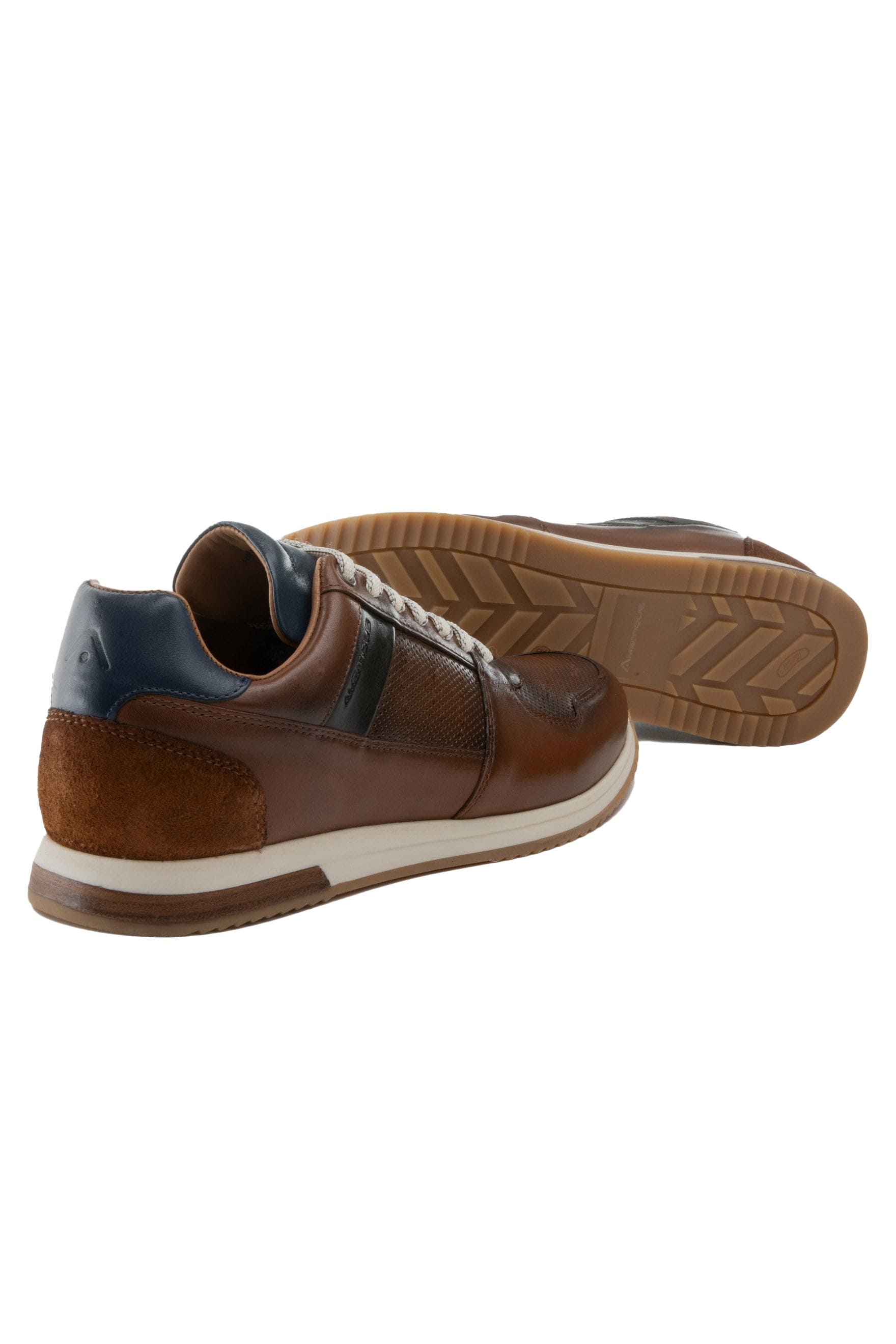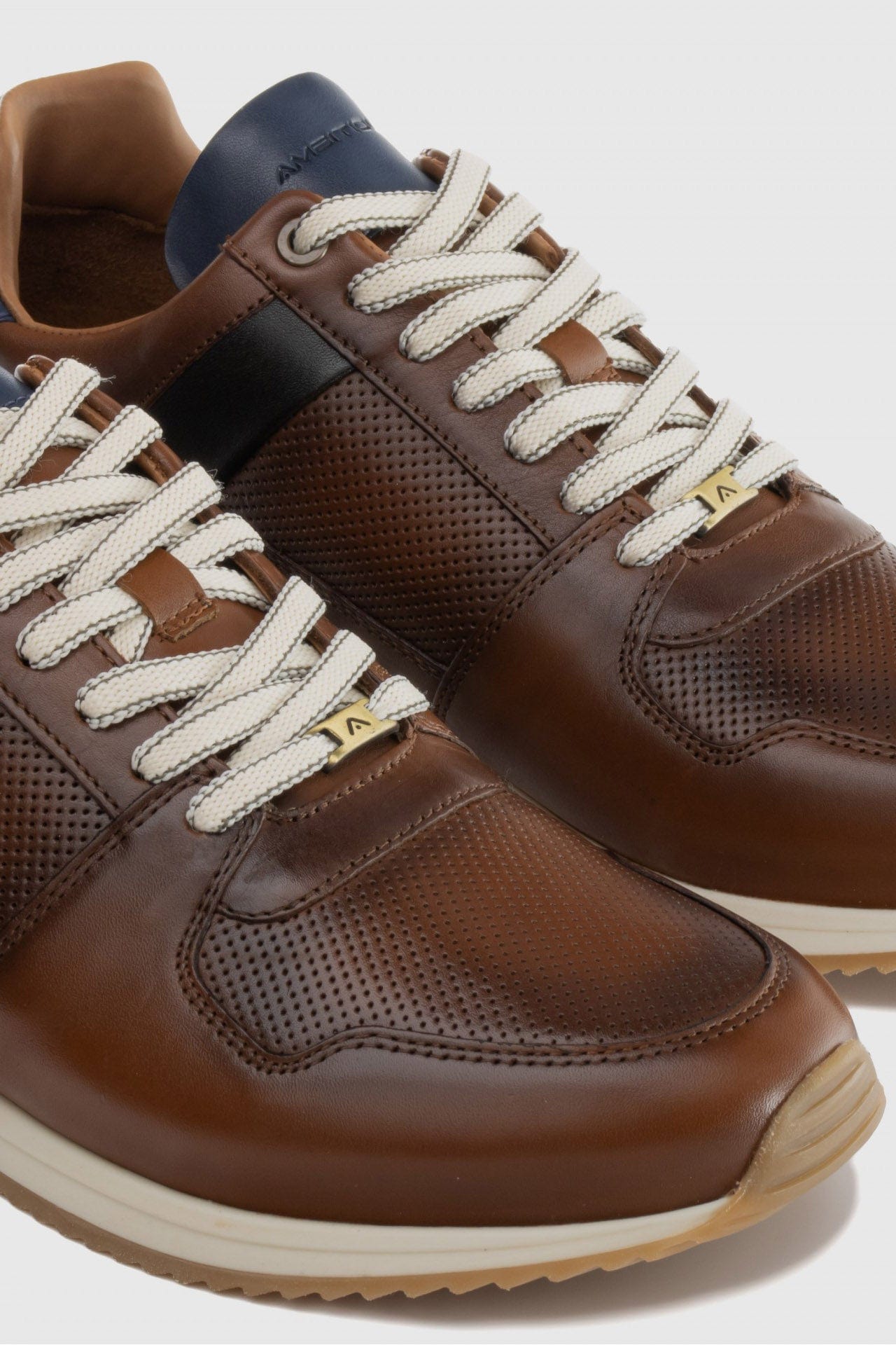 The Ambitious Slow trainer is a timeless style crafted in Portugal from fine leather in a dark cognac and finished with leather navy accents. Finished with an ultra comfortable rubber sole, perfect for all day wear.