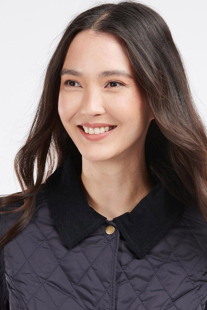 Made with a box-quilted outer with a luxe corduroy collar. Featuring two spacious pockets and popper closures with shaped body seams for a feminine silhouette. Subtle tonal embroidered Barbour branding features on the pocket.
