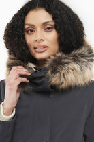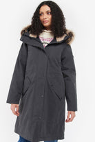 Crafted from Barbour's Cotton Touch waterproof fabric the Belgrave jacket is a waterproof breathable design and showcases a fishtail hem for a feminine feel. Boasting a warm and cosy hood trimmed with a faux fur and lined with a teddy fabric this coat makes the perfect layering piece. Showcasing studded front placket and pockets to the lower body. A Barbour branding to the sleeve effortlessly finishes the garment.