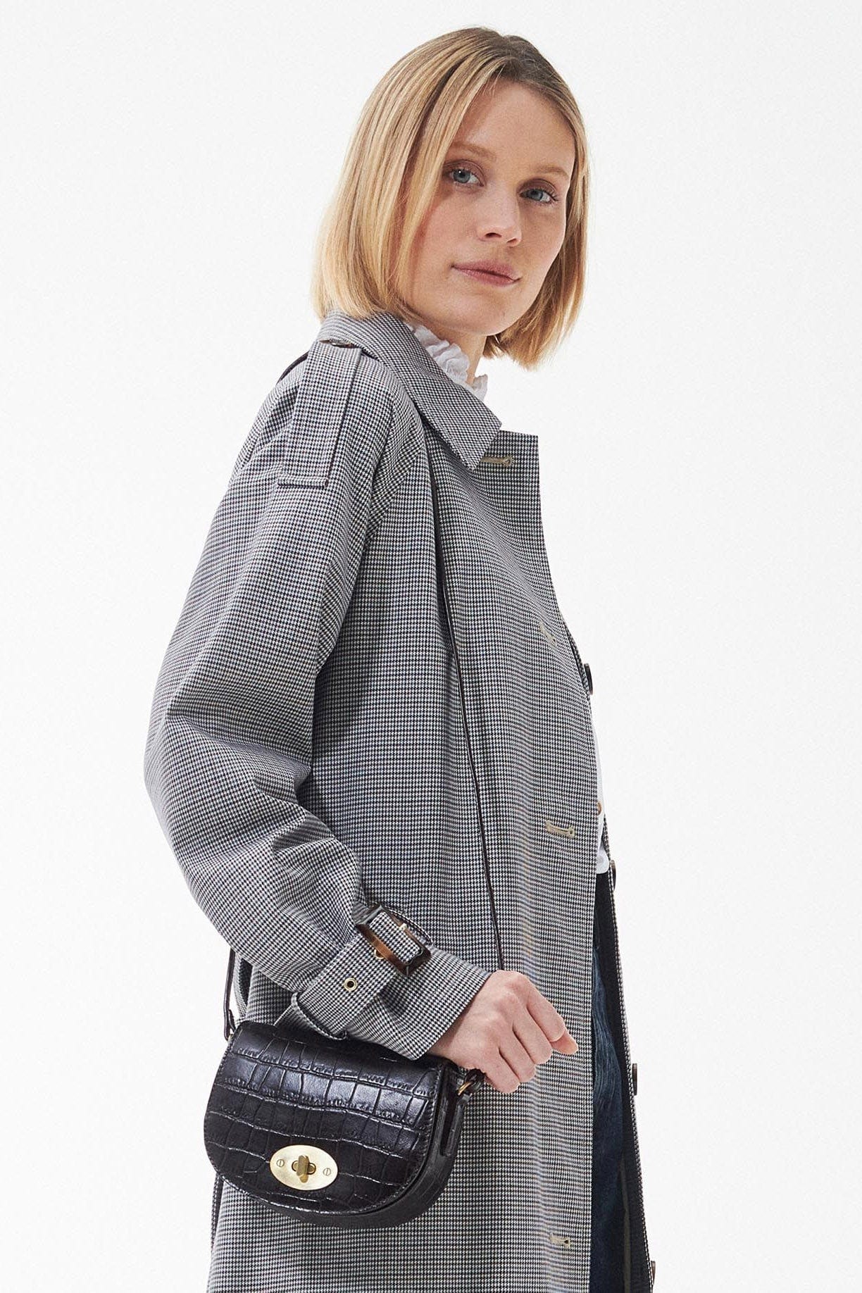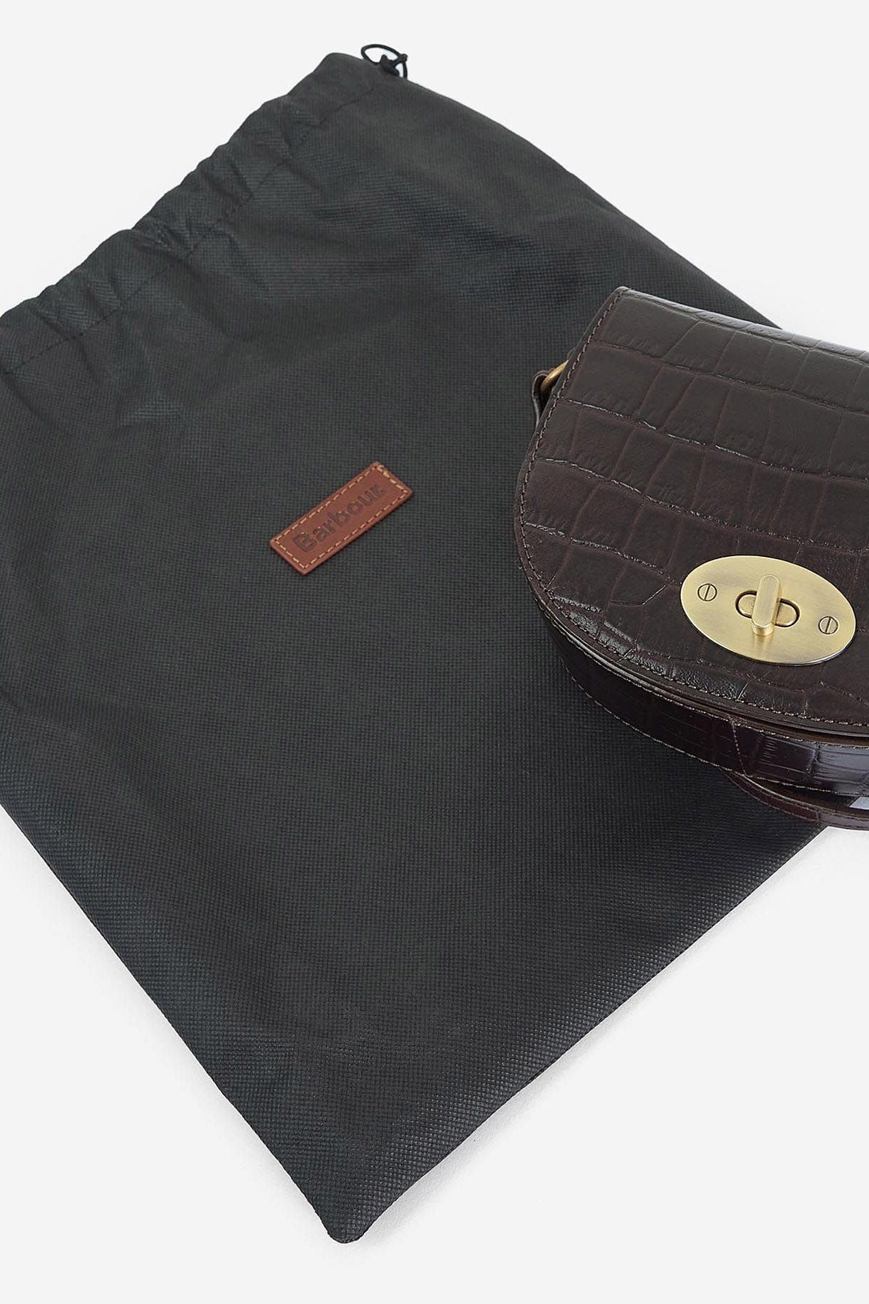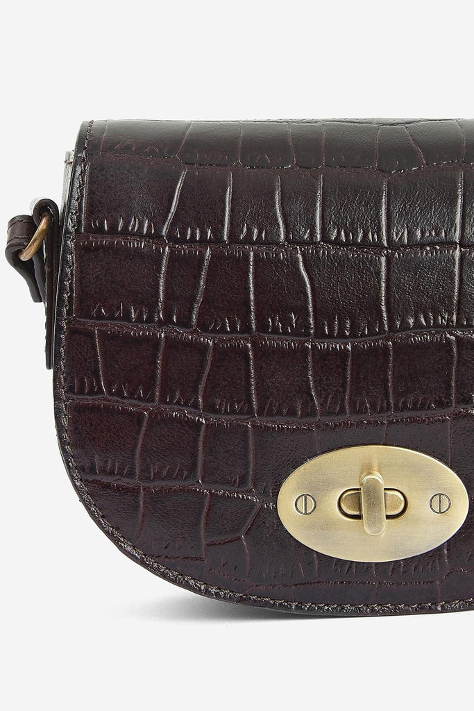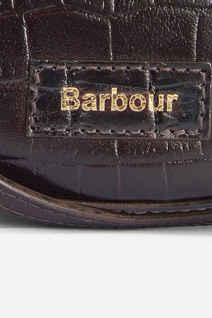 The Barbour Eilein saddle bag has a luxe look and feel to it. Designed with a glossy mock-croc finish, in a rich black cherry shade.