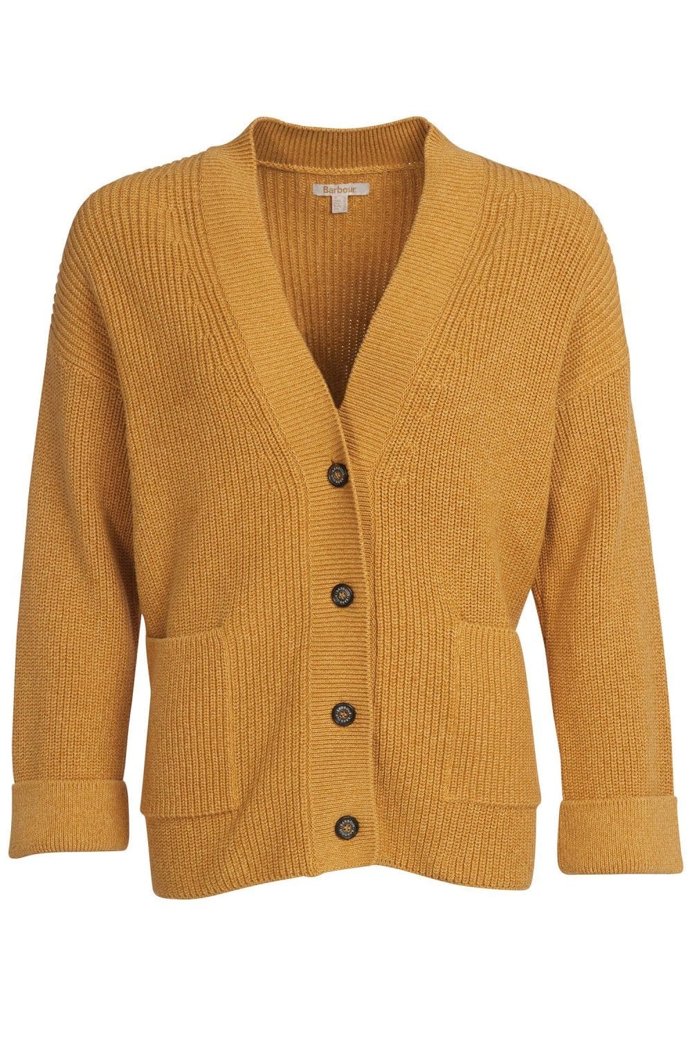 Fashioned with a chunky ribbed knit classic four button front and dropped sleeves for a relaxed look. Handy patch pockets feature to the front with bracelet length sleeves which feature a turnback cuff. The Barbour Beacon triangle plate to the back of the neck completes the look.
