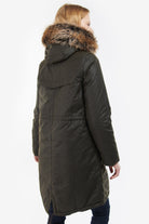 Design details include both spacious patch pockets and handwarmer pockets with zip closures and of course the sherpa lined hoot with faux-fur trim to add style and warmth to your look.