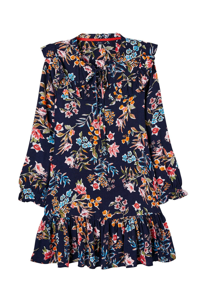 Made from a lovely lenzing EcoVero which is not only soft to the skin but sustainable too. Framed with a pretty frilled neckline with frills also featuring on the shoulders and elasticated cuffs. Cut with a tiered skirt A-Line shape and handy side seam pockets. The self tie bow and multi coloured floral design complete the Joules offering.