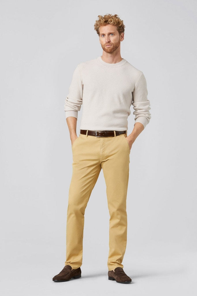Meyer's New York Chinos are refreshed in a soft cotton stretch twill in a eye catching sand shade with Meyers famous printed lining to the pockets.
