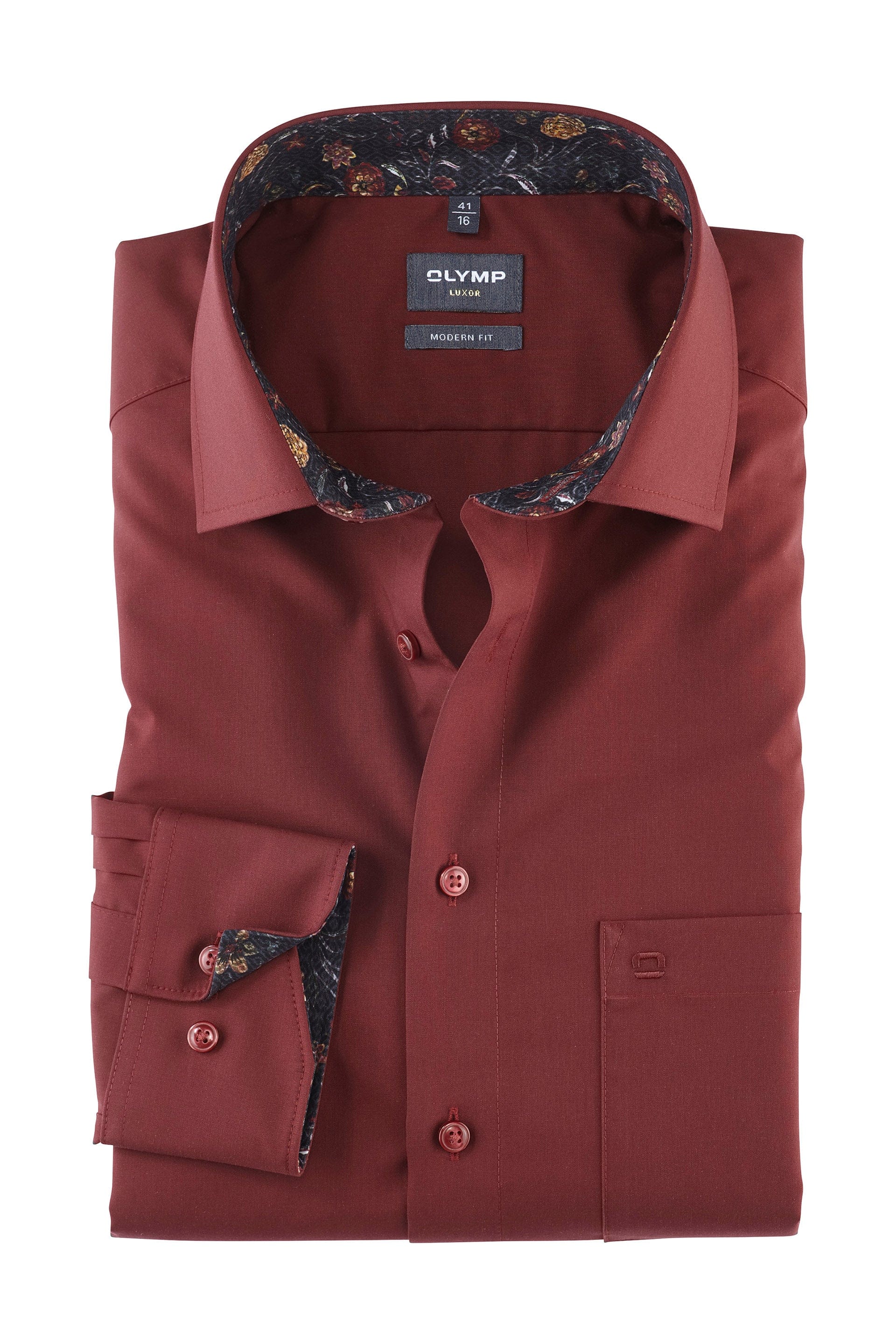Olymp Luxor Modern Fit Plain Long Sleeve Shirt with Trim - Dark Red
