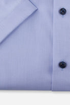 Crafted in a blue plain poplin fabric with contrasting navy buttons and a left chest pocket. Perfect for warmer days thanks to it's short sleeves and Olymp's modern fit. The inside of the collar features a printed trim and the placket solid navy detailing.