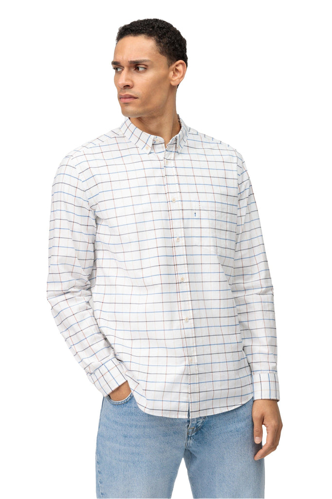 On a soft white ground, this shirt is adorned in a window pane blue and brown check, this edition will pair perfectly with your off-duty attire whilst the two-ply brushed pure cotton fabric makes it perfect for a chillier day. Further details include a regular collar long sleeves and Olymp's embroidered O on the left chest pocket.