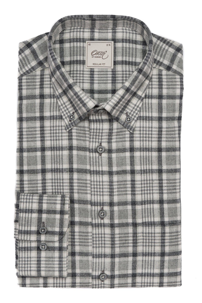 A luxuriously soft brushed cotton flannel Oscar shirt crafted from a European cotton and wool blend cloth. The shirt is adorned in a tonal grey check and finished with a button down collar, the look is completed with the finest two tone grey buttons. This Oscar of Sweden shirt is cut to a regular fit.