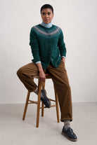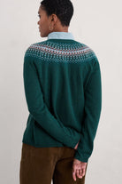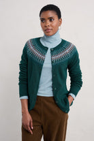 The Seasalt Berlewen cardigan takes inspiration from a river spring in hues of teal, blue and brown. Adorned with fair isle detailing to the yoke and shoulders.