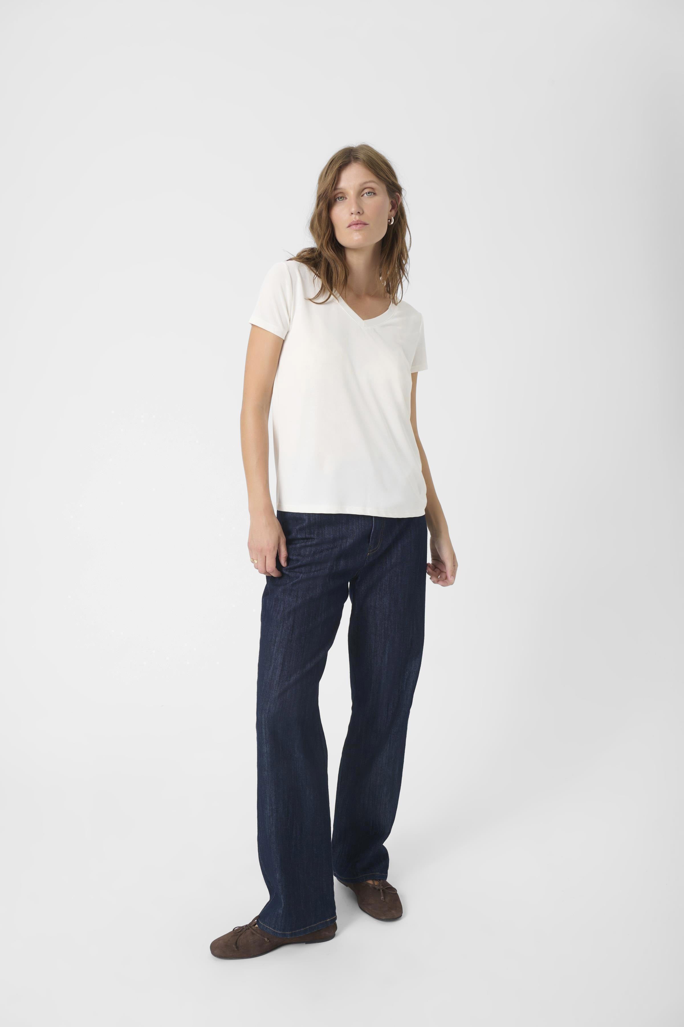This short-sleeved top features a flattering V-neckline that enhances your silhouette, offering a soft drape that feels luxurious against the skin. Machine washable for easy care, it pairs seamlessly with tailored trousers or jeans, elevating everyday looks with its subtle sophistication and versatile broken white hue.