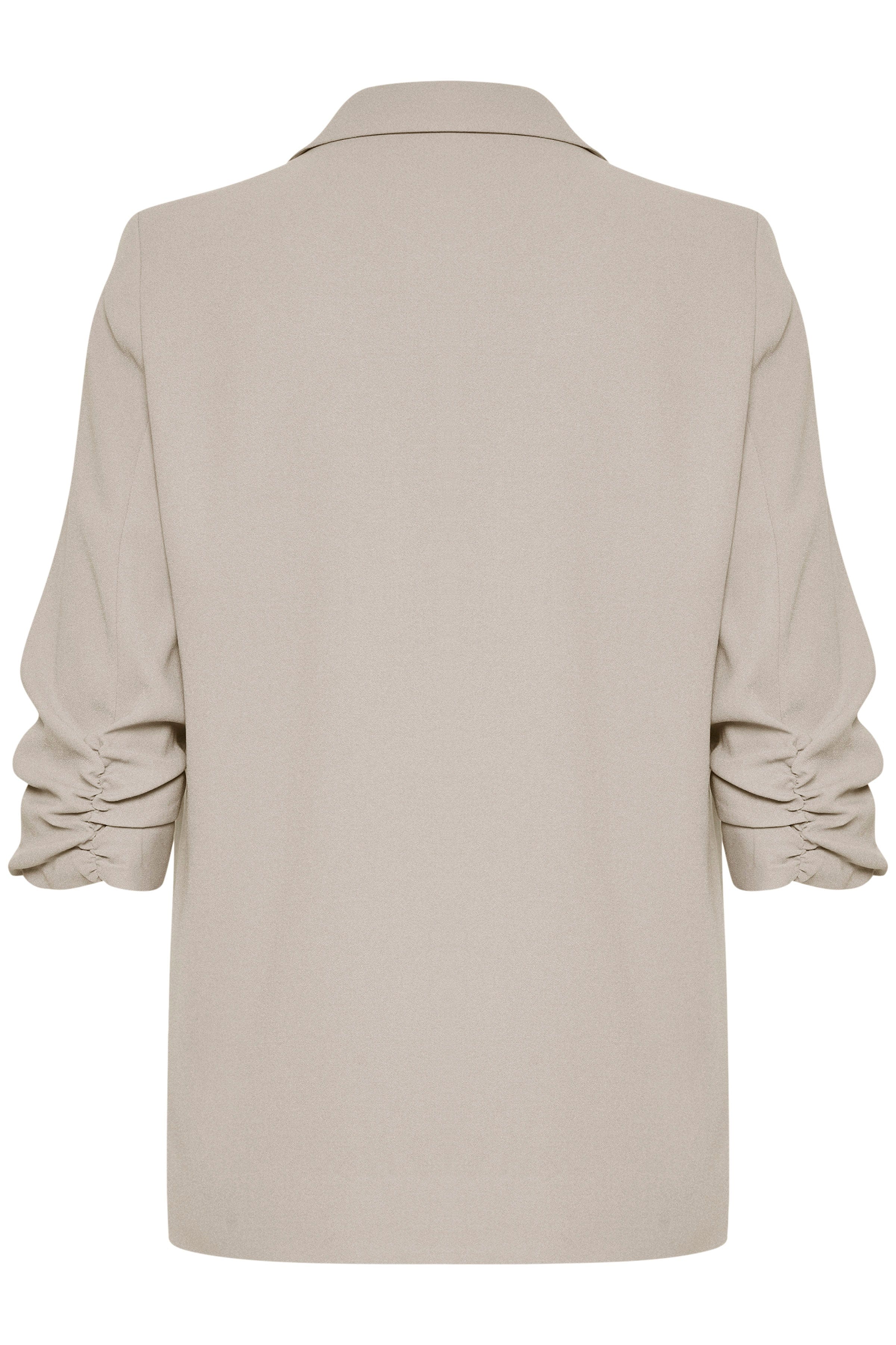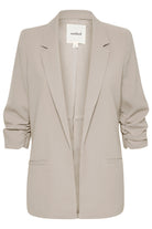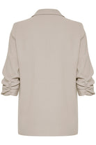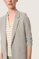 Made from a lightweight fluid fabric which creates a feminine yet tailored silhouette. Featuring a notch lapel, ruched detailing to the three quarter length sleeves and sitting at around hip length.