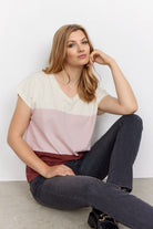 Boasting a bold colour block stripe in a cream wine red and rosy pink this tee has a flattering V-neck and is made from the softest organic cotton.