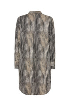 Boasting a unique geometric print in grey white and peach tones this dress is made from 100% sustainable sourced viscose which is soft to the touch and will keep you cool when needed. With button closures reaching half way down and long sleeves with triple buttoned cuffs this dress is sure to be a smart but stylish addition to your closet.