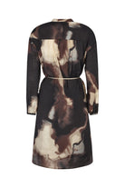 Crafted from a blend of responsibly produced viscose and nylon which provides a beautiful feminine drape this dress boasts a unique marble pattern in warm coffee tones. Reaching just below the knee with a slight slit at the front this dress features long sleeves with delicate gathers at the cuffs a high-neck with button closure and a tie-waist for shaping. Featuring a placket V-neck closure and single button cuffs finished with a feminine ruffle detailing.
