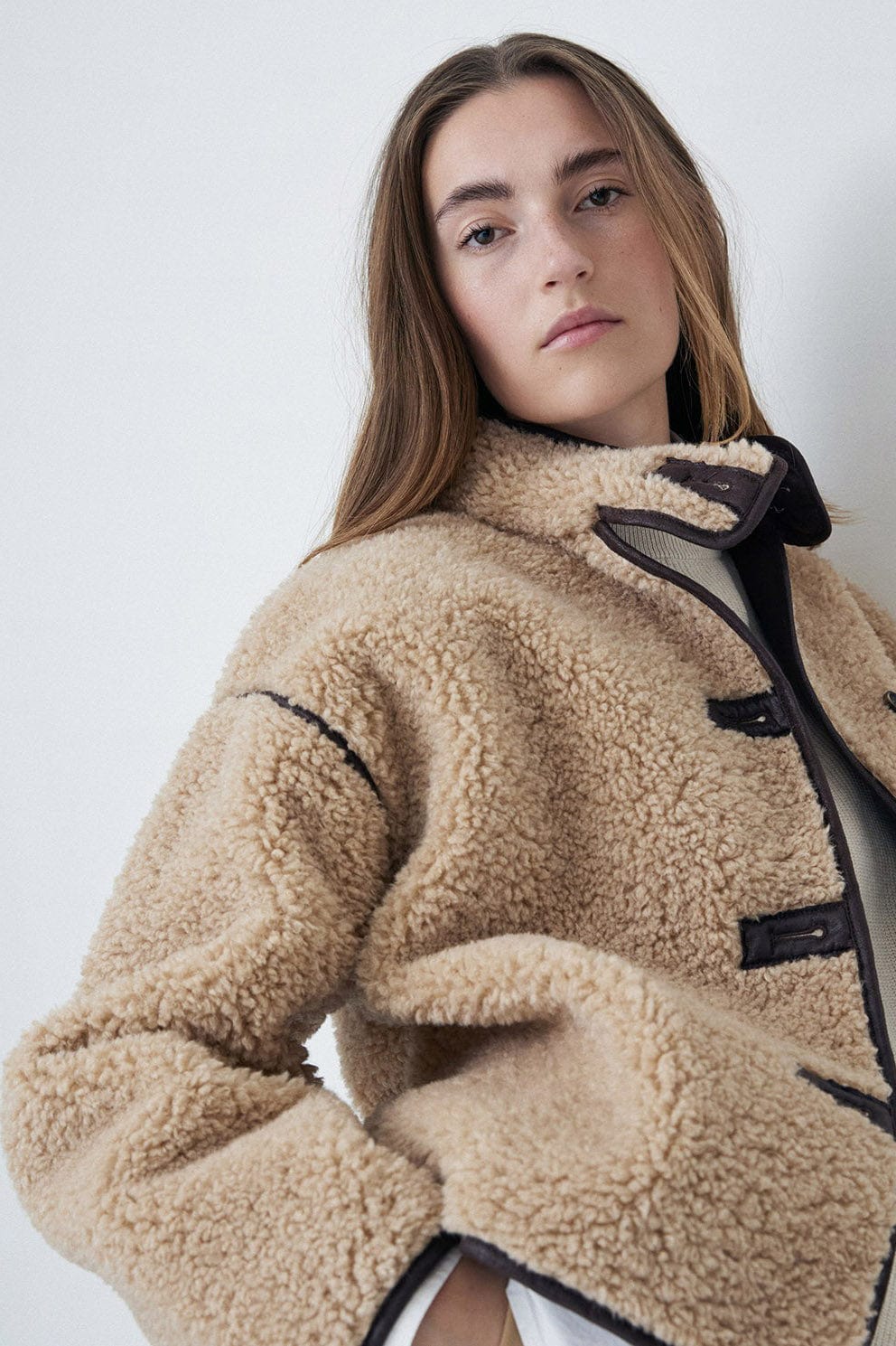 A shearling jacket is the jacket of the season. A super soft and snuggly look to it but with luxe piped trim detailing and a statement button through front